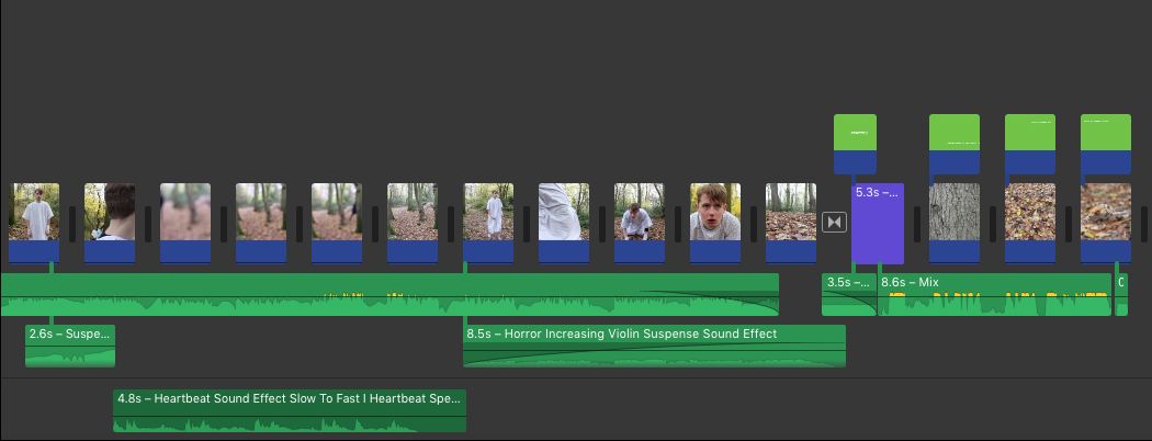 Putting sound effects and a backing track was fairly simple because we had already found a lot of material in the sound research task. Therefore, we could simply copy them into IMovie and put them in the right areas to add effect. I believe that the sound we have included adds a lot of tension and is used in the right context. For example, the sound becomes more intense at the stage where he starts to go mad to help the audience see this. We have also included sound effects like a heartbeat as a reminder to the audience that something is about to go wrong or that all is not as it seems.